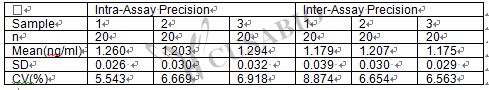 Three samples of known concentration were tested twenty times on one plate to assess.Inter-assay Precision (Precision between assays): CV%<10%Three samples of known concentration were tested in twenty assays to assess.