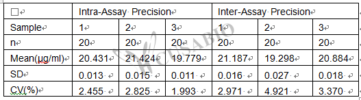 Three samples of known concentration were tested twenty times on one plate to assess.Inter-assay Precision (Precision between assays): CV%<10%Three samples of known concentration were tested in twenty assays to assess.