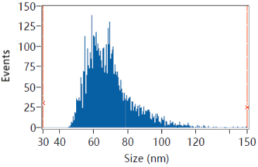 產(chǎn)品評(píng)價(jià):所提取的外泌體結(jié)構(gòu)完成,呈典型的茶托裝,平均粒徑69nm,濃度達(dá)到10^10 Particles/mL以上,結(jié)果良好