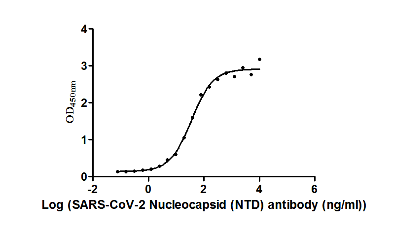 The Binding Activity of N protein with N Antibody. Activity: Measured by its binding ability in a functional ELISA. Immobilized N at 2 μg/ml can bind N Antibody, the EC50 of N Antibody.