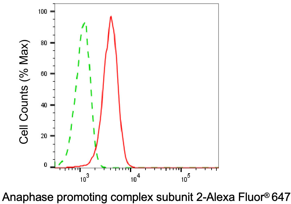 • Flow cytometric analysis of Anaphase promoting complex subunit 2 expression in C2C12 cells using Anaphase promoting complex subunit 2 antibody. Green, isotype control; red, Anaphase promoting complex subunit 2.