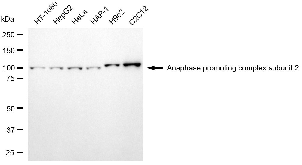 • Western blotting analysis using anaphase promoting complex subunit 2 antibody. Total cell lysates (30 μg) from various cell lines were loaded and separated by SDS-PAGE. The blot was incubated with anaphase promoting complex subunit 2 antibody and HRP-conjugated goat anti-mouse secondary antibody respectively.