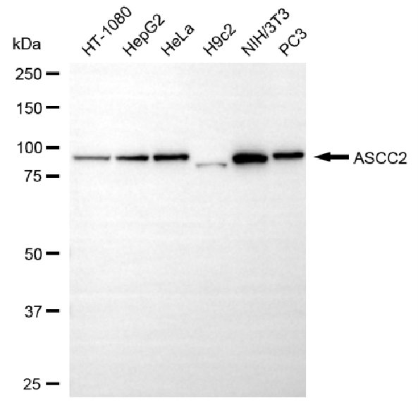 Western blotting analysis using ASCC2 antibody. Total cell lysates (30 μg) from various cell lines were loaded and separated by SDS-PAGE. The blot was incubated with ASCC2 antibody and HRP-conjugated goat anti-mouse secondary antibody respectively.