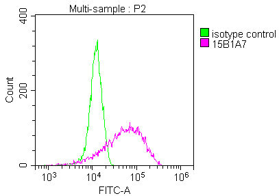 Overlay Peak curve showing Hela cells stained with CSB-MA004485A1m (red line) at 1:140. The cells were incubated in 10% normal goat serum to block non-specific protein-protein interactions followed by the antibody (1μg/1*106cells) for 1h at 4°C. The secondary antibody used was FITC-conjugated Goat Anti-Mouse IgG(H+L) at 1/100 dilution for 30min at 4°C. Isotype control antibody (green line) was mouse IgG1 (1μg/1*106cells) used under the same conditions. Acquisition of >10,000 events was performed.