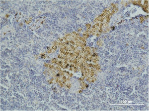 • Immunohistochemical analysis of paraffin-embedded Mouse Spleen Tissue using Caspase-8 Monoclonal Antibody.