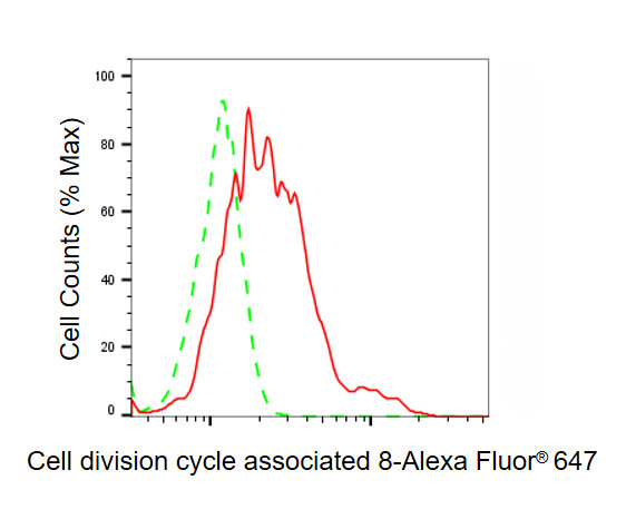 • Flow cytometric analysis of Cell division cycle associated 8 expression in HAP-1 cells using Cell division cycle associated 8 antibody. Green, isotype control; red, Cell division cycle associated 8.