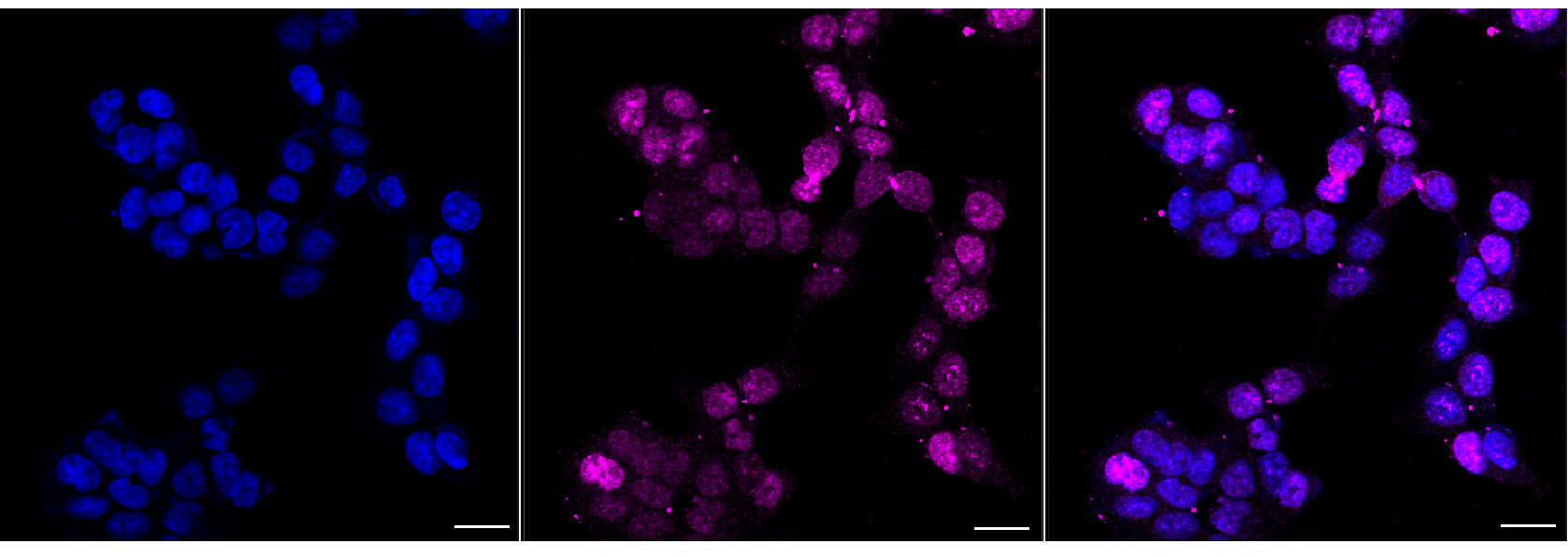 • Immunocytochemical staining of HAP-1 cells with Cell division cycle associated 8 antibody. Nuclei were stained blue with DAPI; Cell division cycle associated 8 was stained magenta with Alexa Fluor? 647. Images were taken using Leica stellaris 5. Protein abundance based on laser Intensity and smart gain: Medium. Scale bar, 20 μm.
