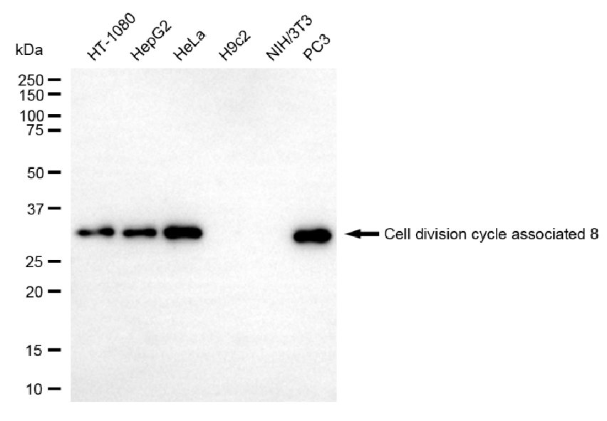 • Western blotting analysis using cell division cycle associated 8 antibody. Total cell lysates (30 μg) from various cell lines were loaded and separated by SDS-PAGE. The blot was incubated with cell division cycle associated 8 antibody and HRP-conjugated goat anti-mouse secondary antibody respectively.