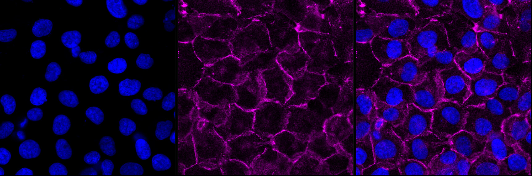 • Immunocytochemical staining of HT-1080 cells with Catenin beta 1 antibody. Nuclei were stained blue with DAPI; Catenin beta 1 was stained magenta with Alexa Fluor? 647. Images were taken using Leica stellaris 5. Protein abundance based on laser Intensity and Smart Gain:Medium. Scale bar, 20 μm.