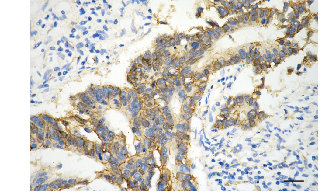 • Immunohistochemistry was performed on paraffin-embedded human sigmoid colon carcinoma using catenin beta 1 antibody. Antigen retrieval was done in sodium citrate buffer (pH 6.0). DAB was used for detection, with hematoxylin counterstaining. Images were acquired using a Nikon Ci-L Plus microscope (40× objective). Scale bar: 25 μm.