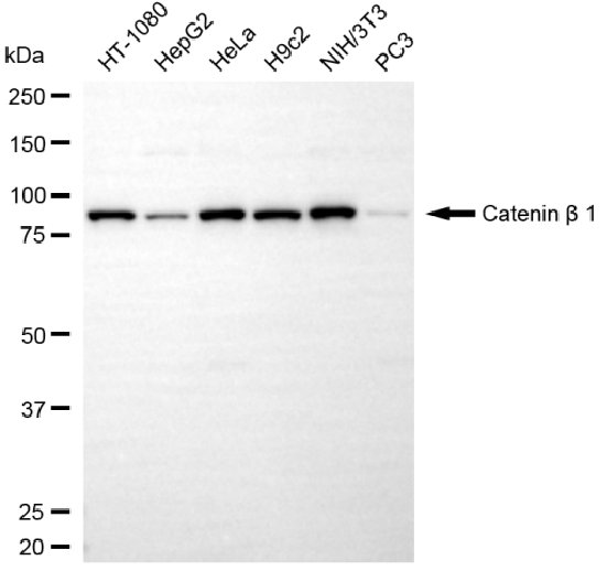 • Western blotting analysis using catenin beta 1 antibody. Total cell lysates (30 μg) from various cell lines were loaded and separated by SDS-PAGE. The blot was incubated with catenin beta 1 antibody and HRP-conjugated goat anti-mouse secondary antibody respectively.