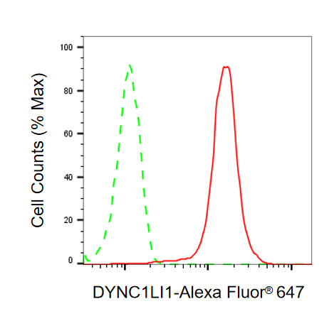 Flow cytometric analysis of DYNC1LI1 expression in HepG2 cells using DYNC1LI1 antibody. Green, isotype control; red, DYNC1LI1.