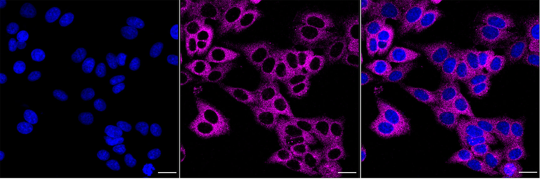 Immunocytochemical staining of HepG2 cells with DYNC1LI1 antibody. Nuclei were stained blue with DAPI; DYNC1LI1 was stained magenta with Alexa Fluor? 647. Images were taken using Leica stellaris 5. Protein abundance based on laser Intensity and smart gain: Medium. Scale bar, 20 μm.