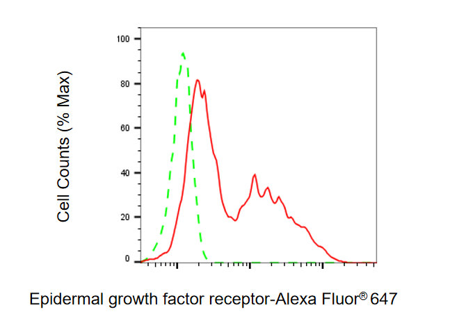 Flow cytometric analysis of Epidermal growth factor receptor expression in HepG2 cells using Epidermal growth factor receptor antibody. Green, isotype control; red, Epidermal growth factor receptor.