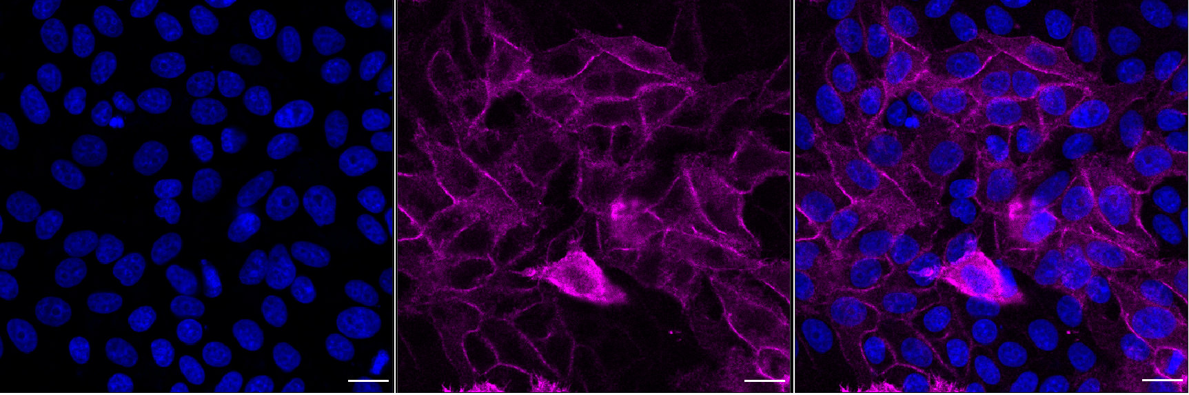 Immunocytochemical staining of HepG2 cells with Epidermal growth factor receptor antibody. Nuclei were stained blue with DAPI; Epidermal growth factor receptor was stained magenta with Alexa Fluor? 647. Images were taken using Leica stellaris 5. Protein abundance based on laser Intensity and Smart Gain: Medium. Scale bar, 20 μm.