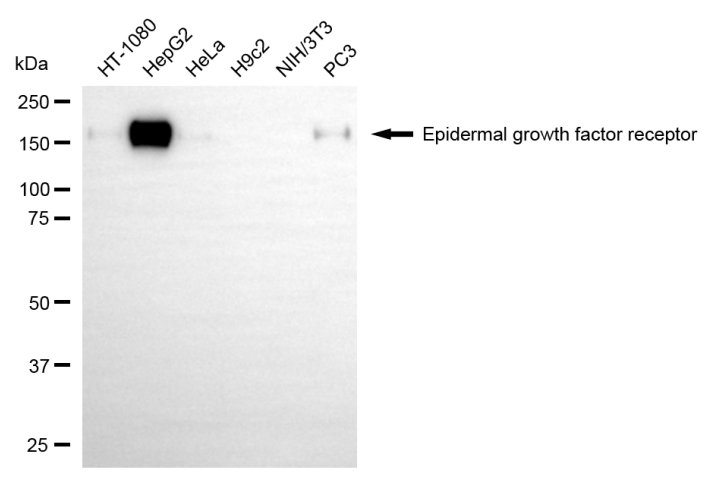 Western blotting analysis using epidermal growth factor receptor antibody. Total cell lysates (30 μg) from various cell lines were loaded and separated by SDS-PAGE. The blot was incubated with epidermal growth factor receptor antibody and HRP-conjugated goat anti-rabbit secondary antibody respectively.