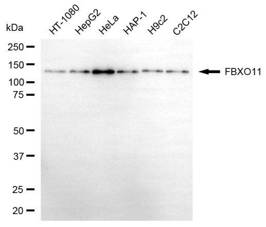 Western blotting analysis using FBXO11 antibody. Total cell lysates (30 μg) from various cell lines were loaded and separated by SDS-PAGE. The blot was incubated with FBXO11 antibody and HRP-conjugated goat anti-mouse secondary antibody respectively.