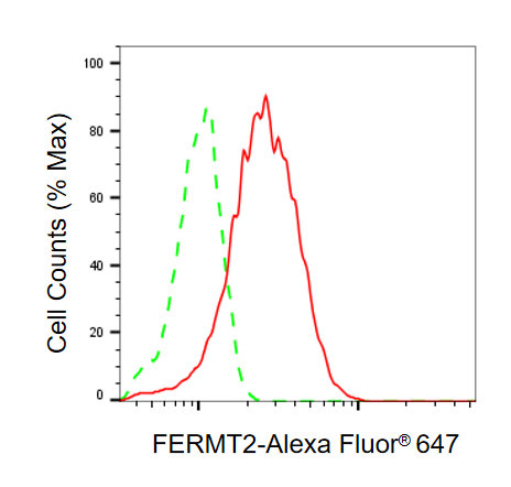 Flow cytometric analysis of FERMT2 expression in HepG2 cells using FERMT2 antibody. Green, isotype control; red, FERMT2.