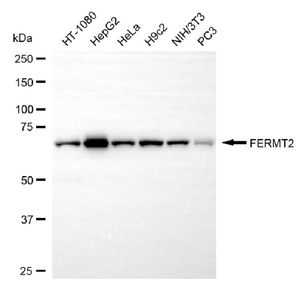 Western blotting analysis using FERMT2 antibody. Total cell lysates (30 μg) from various cell lines were loaded and separated by SDS-PAGE. The blot was incubated with FERMT2 antibody and HRP-conjugated goat anti-mouse secondary antibody respectively.