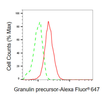 Flow cytometric analysis of Granulin precursor expression in HepG2 cells using Granulin precursor antibody. Green, isotype control; red, Granulin precursor.