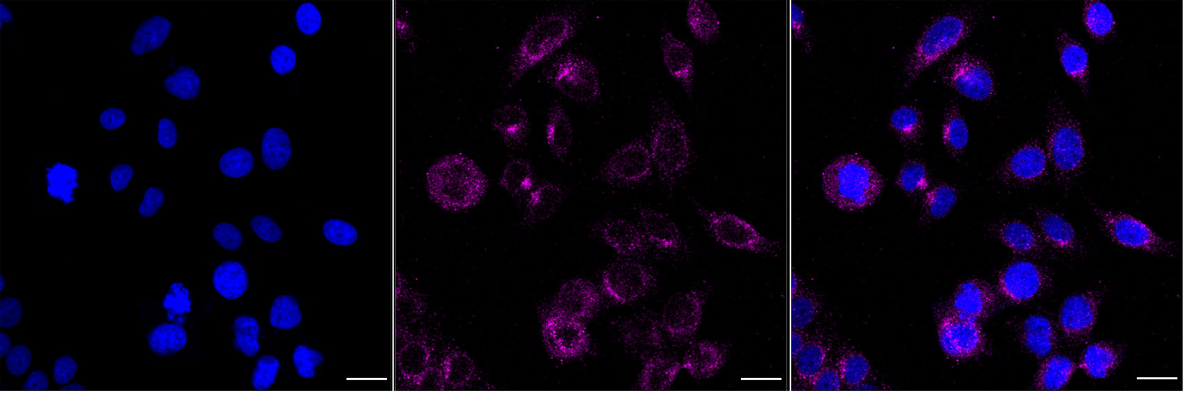 Immunocytochemical staining of HepG2 cells with Granulin precursor antibody. Nuclei were stained blue with DAPI; Granulin precursor was stained magenta with Alexa Fluor? 647. Images were taken using Leica stellaris 5. Protein abundance based on laser Intensity and Smart Gain:Low. Scale bar, 20 μm.