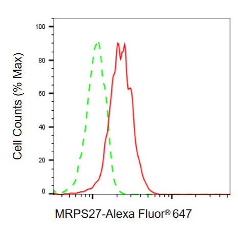 • Flow cytometric analysis of MRPS27 expression in HT-1080 cells using MRPS27 antibody. Green, isotype control; red, MRPS27.