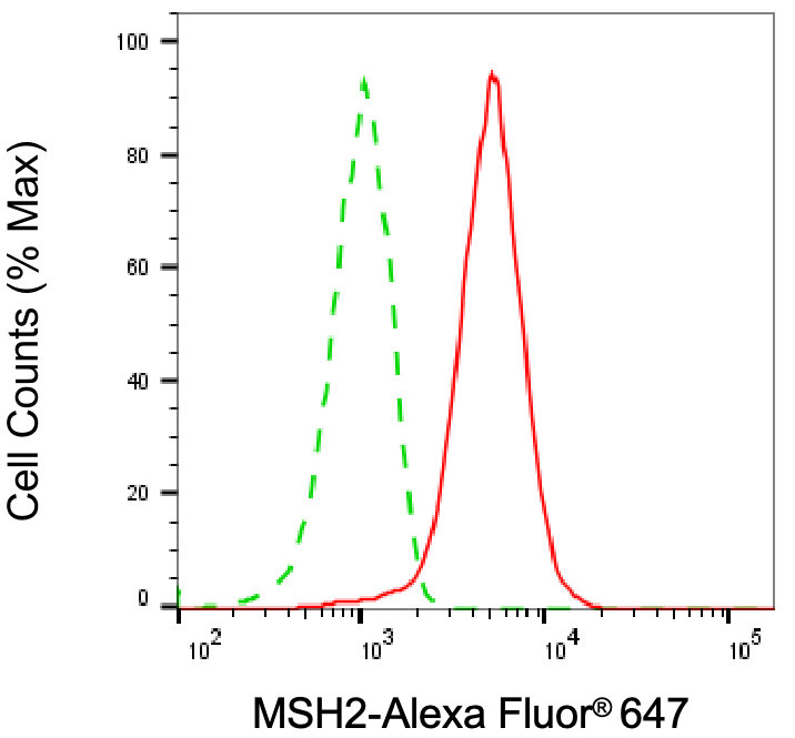 • Flow cytometric analysis of MSH2 expression in HAP-1 cells using MSH2 antibody. Green, isotype control; red, MSH2.