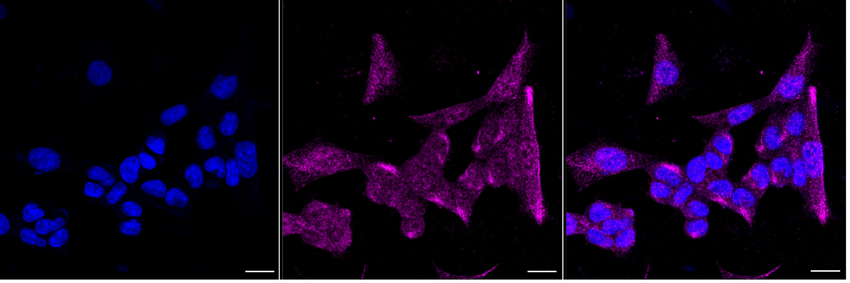 • Immunocytochemical staining of HAP-1 cells with MSH2 antibody. Nuclei were stained blue with DAPI; MSH2 was stained magenta with Alexa Fluor? 647. Images were taken using Leica stellaris 5. Protein abundance based on laser Intensity and Smart Gain:Medium. Scale bar, 20 μm.