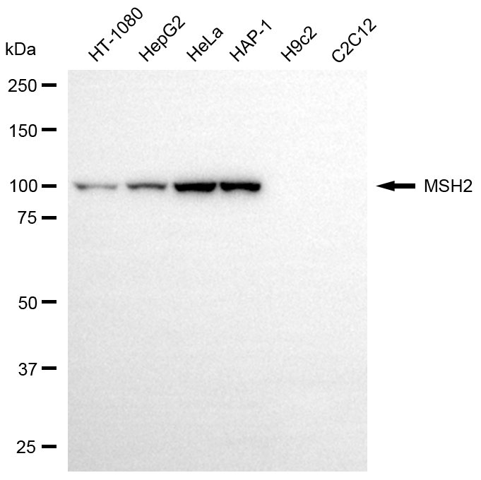 • Western blotting analysis using MSH2 antibody. Total cell lysates (30 μg) from various cell lines were loaded and separated by SDS-PAGE. The blot was incubated with MSH2 antibody and HRP-conjugated goat anti-mouse secondary antibody respectively.