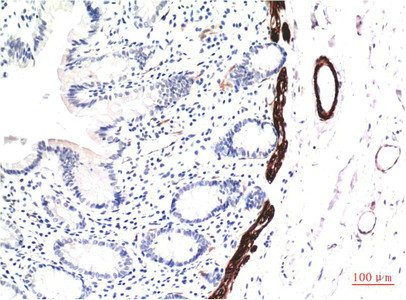 • Immunohistochemical analysis of paraffin-embedded Human Colon Carcinoma Tissue using Muscle Actin Mouse mAb diluted at 1:200.