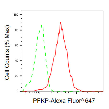 • Flow cytometric analysis of PFKP expression in HepG2 cells using PFKP antibody. Green, isotype control; red, PFKP.