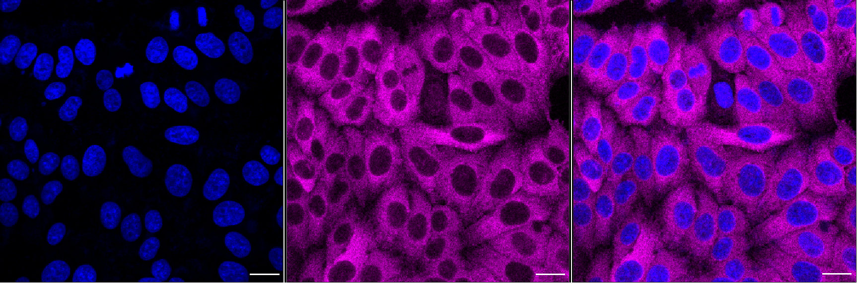 • Immunocytochemical staining of HepG2 cells with PFKP antibody. Nuclei were stained blue with DAPI; PFKP was stained magenta with Alexa Fluor? 647. Images were taken using Leica stellaris 5. Protein abundance based on laser Intensity and Smart Gain: Medium. Scale bar, 20 μm.