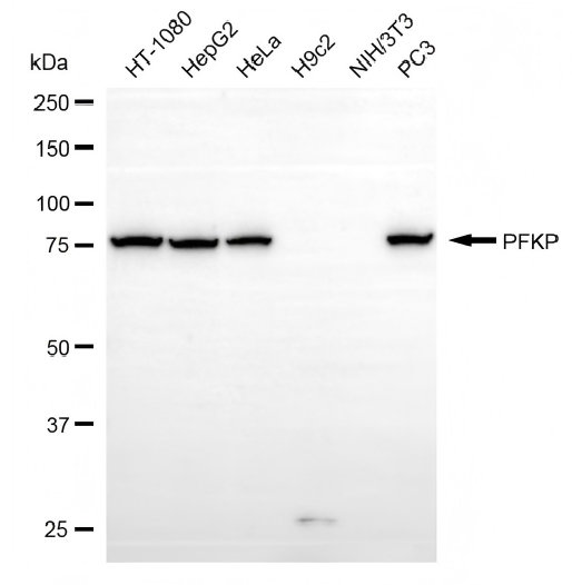 • Western blotting analysis using PFKP antibody. Total cell lysates (30 μg) from various cell lines were loaded and separated by SDS-PAGE. The blot was incubated with PFKP antibody and HRP-conjugated goat anti-mouse secondary antibody respectively.