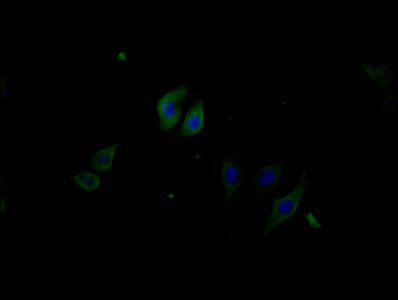 • Immunofluorescence staining of Hela cells with CSB-MA007512PA981phHU at 1:100, counter-stained with DAPI. The cells were fixed in 4% formaldehyde and blocked in 10% normal Goat Serum. The cells were incubated with the antibody overnight at 4°C. Nuclear DNA was labeled in blue with DAPI. The secondary antibody was FITC-conjugated AffiniPure Goat Anti-Mouse IgG (H+L).