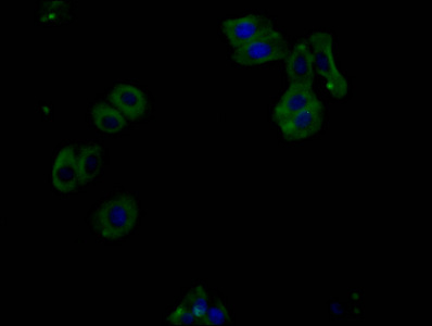 • Immunofluorescence staining of A549 cells with CSB-MA007512PA981phHU at 1:100, counter-stained with DAPI. The cells were fixed in 4% formaldehyde and blocked in 10% normal Goat Serum. The cells were incubated with the antibody overnight at 4°C. Nuclear DNA was labeled in blue with DAPI. The secondary antibody was FITC-conjugated AffiniPure Goat Anti-Mouse IgG (H+L).