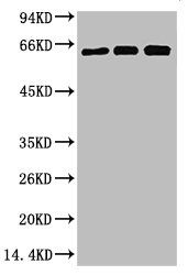 • Western blot analysis of 1) Hela, 2) Rat Heart Tissue, 3) Mouse Spleen Tissue, diluted at 1:2000.