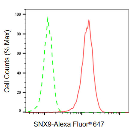 Flow cytometric analysis of SNX9 expression in HeLa cells using SNX9 antibody. Green, isotype control; red, SNX9.
