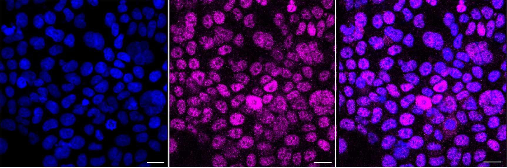 Immunocytochemical staining of Hela cells with WTAP associated protein antibody. Nuclei were stained blue with DAPI; WTAP associated protein was stained magenta with Alexa Fluor? 647. Images were taken using Leica stellaris 5. Protein abundance based on laser Intensity and smart gain: Low. Scale bar, 20 μm. Permeabilization: Triton.