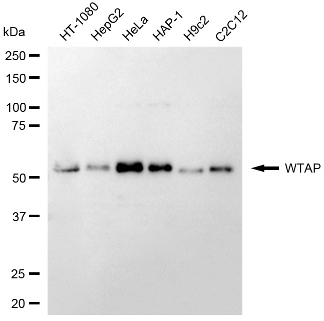 Western blotting analysis using WTAP antibody . Total cell lysates (30 μg) from various cell lines were loaded and separated by SDS-PAGE. The blot was incubated with WTAP antibody and HRP-conjugated goat mouse secondary antibody respectively. Image was developed using FeQ? ECL Substrate Kit .