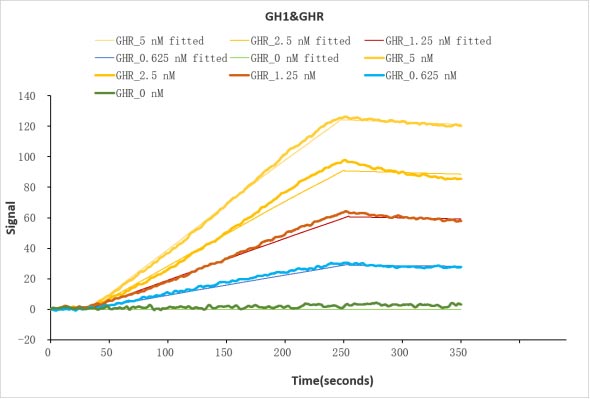 Human GH1 protein his/myc tag (CSB-MP009407HU) captured on COOH chip can bind Human GHR protein Fc tag (CSB-MP009411HU) with an affinity constant of 6.1 nM as detected by LSPR Assay.