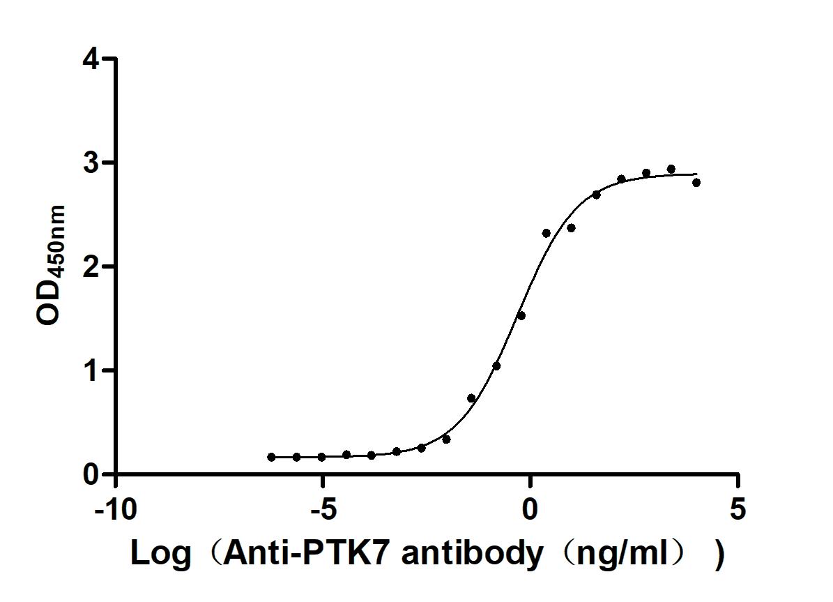 Measured by its binding ability in a functional ELISA. Immobilized Human PTK7 at 2 μg/ml can bind Anti-PTK7 recombinant antibody (CSB-RA622651MA1HU). The EC50 is 0.3675 - 0.65842 ng/mL. Biological Activity Assay -