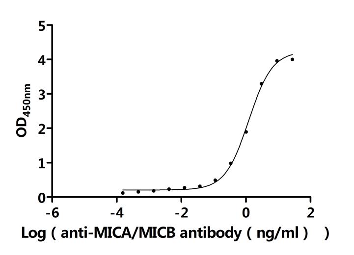 Measured by its binding ability in a functional ELISA. Immobilized Human MICB at 2 μg/ml can bind Anti-MICA/B recombinant antibody (CSB-RA56059MA1HU). The EC50 is 1.087-1.369 ng/mL. Biological Activity Assay
