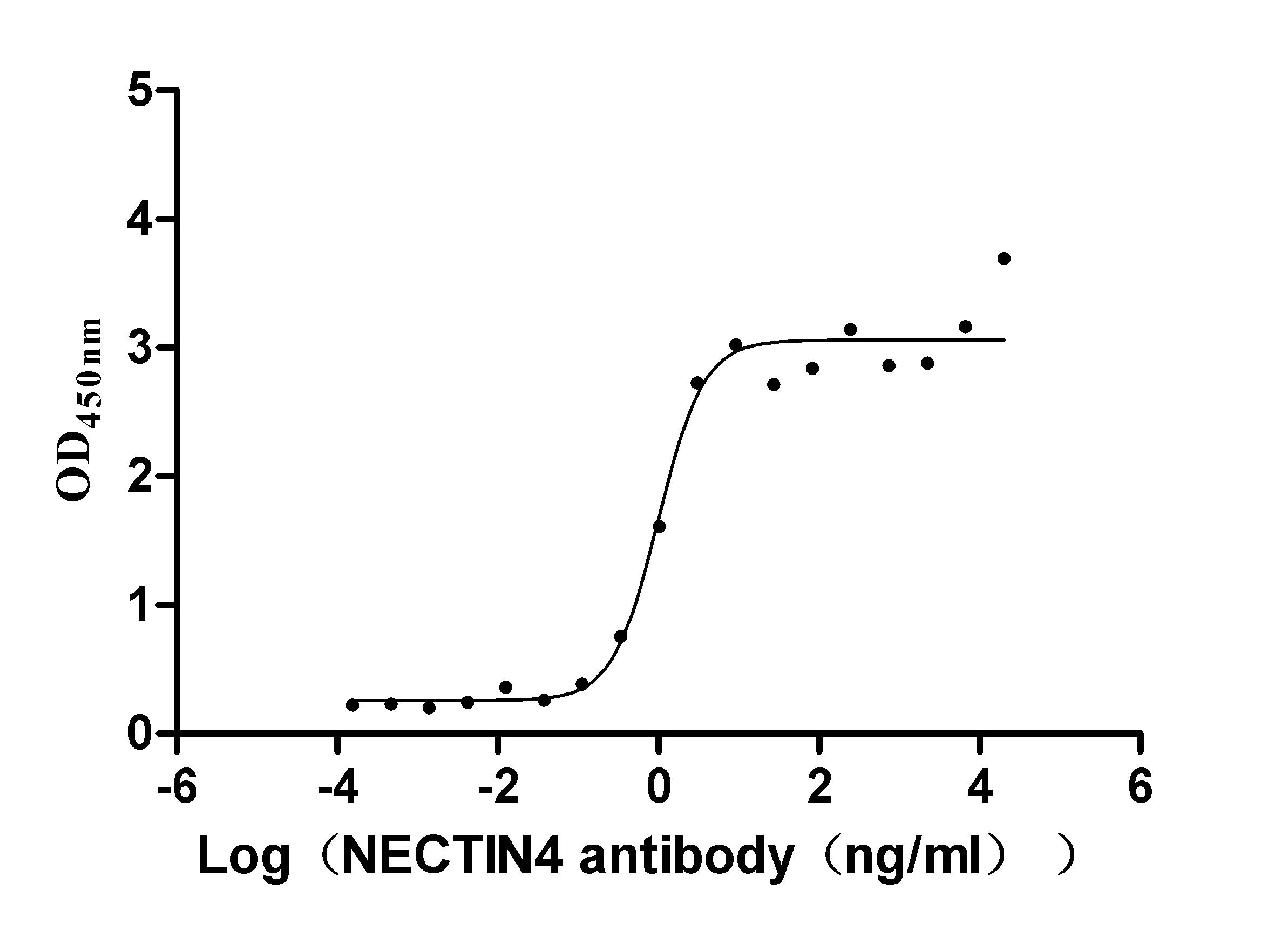 Measured by its binding ability in a functional ELISA. Immobilized NECTIN4 at 2 μg/ml can bind anti-NECTIN4 antibody(CSB-RA822274A0HU)(enfortumab vedotin-like), the EC50 is 0.6029-0.7837 ng/mL. Biological Activity Assay