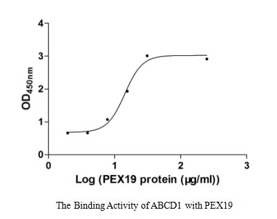 生物活性:Measured by its binding ability in a functional ELISA. Immobilized ABCD1 at 5 μg/ml can bind human PEX19, the EC50 of human PEX19 protein is 22.96-33.00 μg/ml.