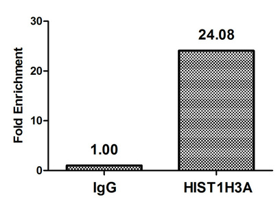 Chromatin Immunoprecipitation Hela (4*106, treated with 30mM sodium 3-hydroxybutyrate for 4h) were treated with Micrococcal Nuclease, sonicated, and immunoprecipitated with 5µg anti-HIST1H3A (CSB-PA010418OA23bhbHU) or a control normal rabbit IgG. The resulting ChIP DNA was quantified using real-time PCR with primers against the β-Globin promoter.