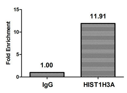 • Chromatin Immunoprecipitation Hela (4*106, treated with 30mM sodium 3-hydroxybutyrate for 4h) were treated with Micrococcal Nuclease, sonicated, and immunoprecipitated with 5μg anti-HIST1H3A (CSB-PA010418OA27bhbHU) or a control normal rabbit IgG. The resulting ChIP DNA was quantified using real-time PCR with primers against the β-Globin promoter.