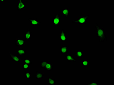 • Immunofluorescence staining of Hela cells with CSB-PA010418OA79bhbHU at 1:5, counter-stained with DAPI. The cells were fixed in 4% formaldehyde, permeabilized using 0.2% Triton X-100 and blocked in 10% normal Goat Serum. The cells were then incubated with the antibody overnight at 4°C. The secondary antibody was Alexa Fluor 488-congugated AffiniPure Goat Anti-Rabbit IgG(H+L).