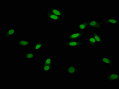 Immunofluorescence staining of Hela cells with CSB-PA010418OA56hibHU at 1:15, counter-stained with DAPI. The cells were fixed in 4% formaldehyde, permeabilized using 0.2% Triton X-100 and blocked in 10% normal Goat Serum. The cells were then incubated with the antibody overnight at 4°C. The secondary antibody was Alexa Fluor 488-congugated AffiniPure Goat Anti-Rabbit IgG(H+L).