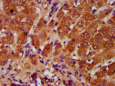 IHC image of CSB-PA883373LA01HU diluted at 1:400 and staining in paraffin-embedded human liver tissue performed on a Leica BondTM system. After dewaxing and hydration, antigen retrieval was mediated by high pressure in a citrate buffer (pH 6.0). Section was blocked with 10% normal goat serum 30min at RT. Then primary antibody (1% BSA) was incubated at 4°C overnight. The primary is detected by a biotinylated secondary antibody and visualized using an HRP conjugated SP system.