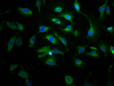 Immunofluorescence staining of U251 cells with CSB-PA22439A0Rb at 1:166, counter-stained with DAPI. The cells were fixed in 4% formaldehyde, permeabilized using 0.2% Triton X-100 and blocked in 10% normal Goat Serum. The cells were then incubated with the antibody overnight at 4°C. The secondary antibody was Alexa Fluor 488-congugated AffiniPure Goat Anti-Rabbit IgG(H+L).